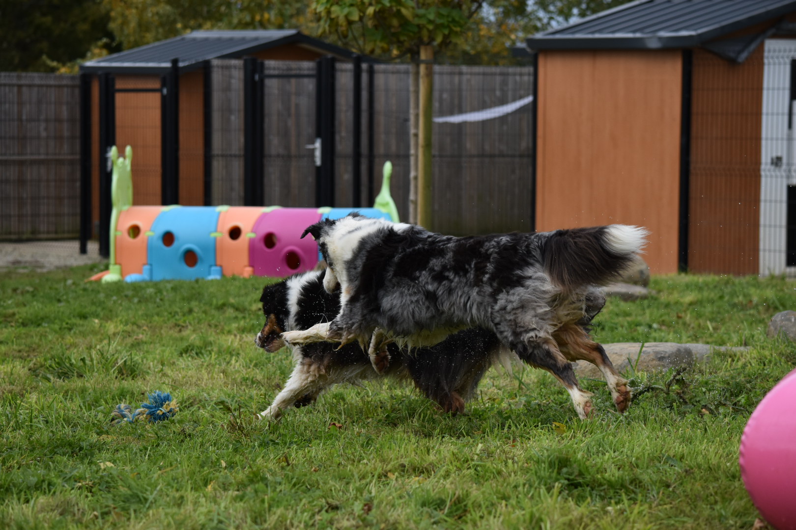 Votre chien sera logé dans un joli chalet avec un autre compagnon, selon ses affinités, avec accès permanent à un parc privatif de 30m2. Des sorties dans un grand parc de jeux de 1000m2 avec d’autres copains canins, par petits groupes de chiens sociables et toujours sous surveillance, sont prévues une majeure partie de la journée. Diverses activités sont proposées chaque jour afin que votre animal s’épanouisse durant son séjour, telles que mastication, recherche de friandises, baignade, jeux, petits parcours etc…